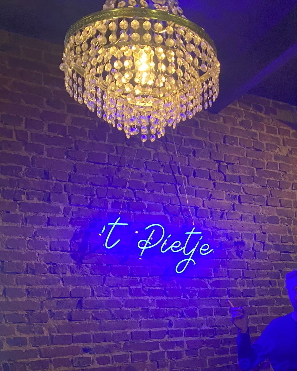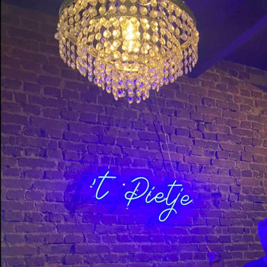 Wat een prachtige neonlamp! Het ontwerp van 't Pietje is precies zoals we wilden. De combinatie met de bakstenen muur en kroonluchter is geweldig. ’s Avonds geeft het een warme en gezellige sfeer. Dank jullie wel voor het vakwerk!