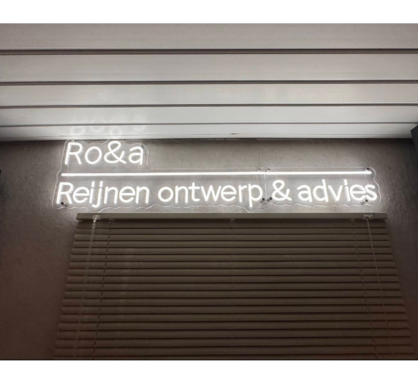 De “Ro&a – Reijnen ontwerp & advies” neon is helder en duidelijk leesbaar, zelfs van afstand. Het geeft onze werkruimte een moderne uitstraling zonder te overheersen. De communicatie en levering waren vlot en professioneel